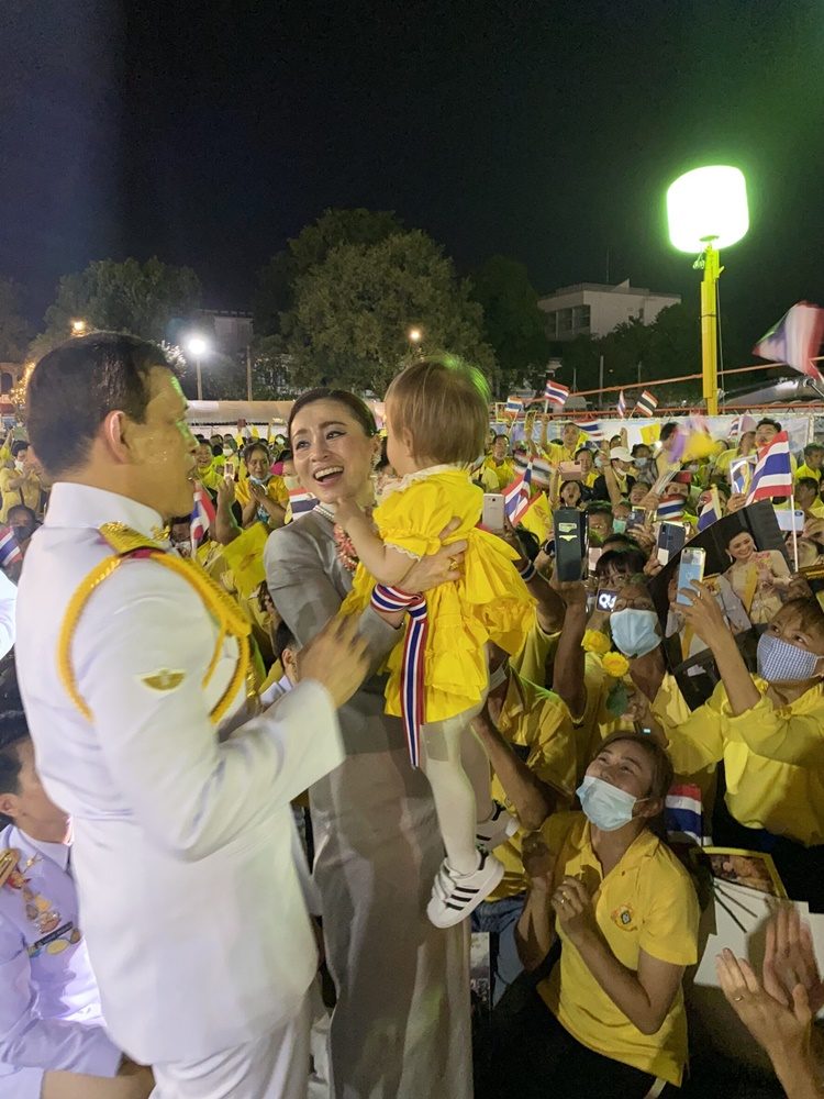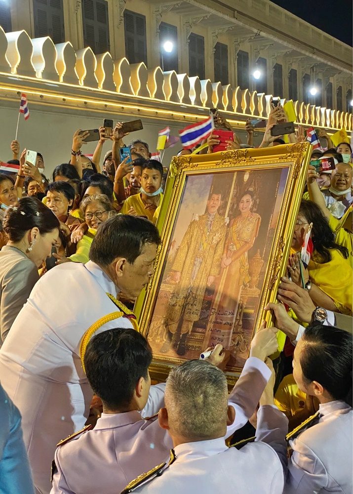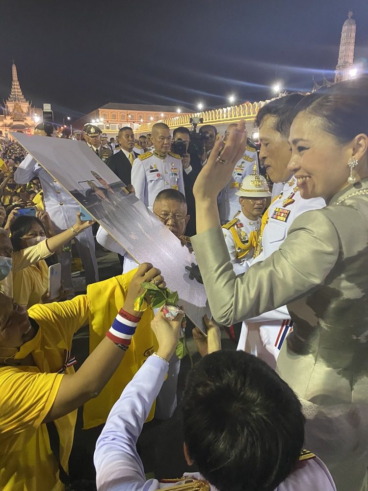 ทุกพระองค์แย้มพระสรวลและโบกพระหัตถ์ทักทายประชาชน ไปถึงด้านหน้าพระบรมมหาราชวัง เลี้ยวขวาไปถึงหน้าศาลหลักเมือง ไปจนถึงหน้าศาลฎีกา โดยมีประชาชนเฝ้าฯ รับเสด็จตลอดเส้นทาง ต่างโบกธงชาติไทย ธงพระปรมาภิไธย วปร ธงพระนามาภิไธย สท ปลิวไสว พร้อมเปล่งเสียง “ทรงพระเจริญดัง” กึกก้อง ตลอด 2 ข้างทาง