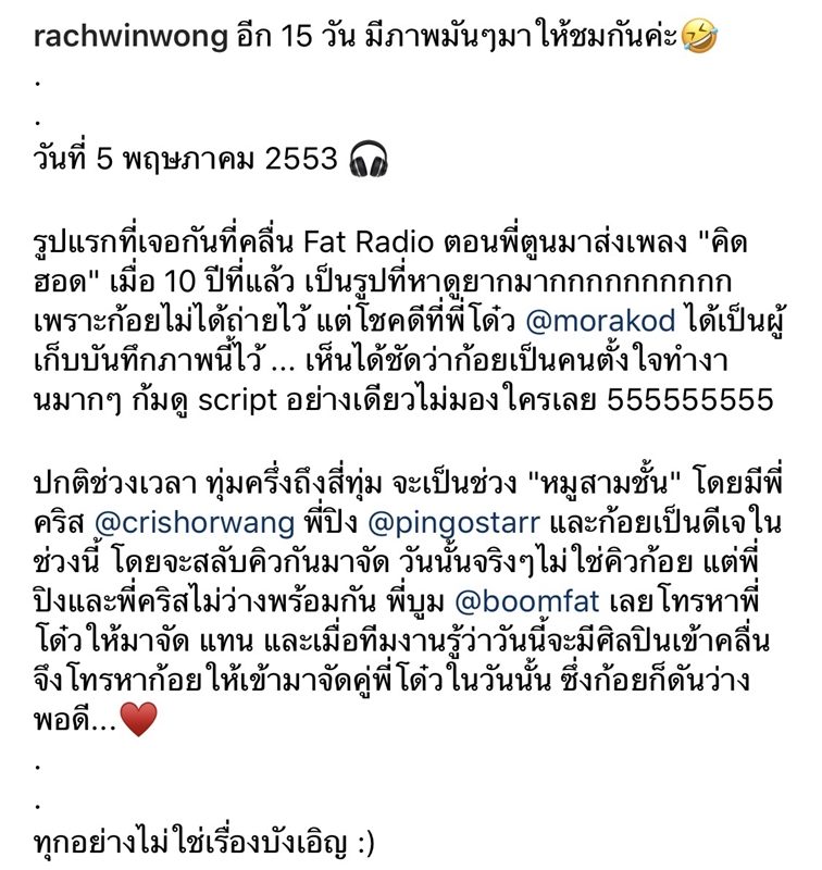 “วันที่ 5 พฤษภาคม 2553 รูปแรกที่เจอกันที่คลื่น Fat Radio ตอนพี่ตูนมาส่งเพลง “คิดฮอด” เมื่อ 10 ปีที่แล้ว เป็นรูปที่หาดูยากมากกกกกกกกกก เพราะก้อยไม่ได้ถ่ายไว้ แต่โชคดีที่พี่โด๋ว @morakod ได้เป็นผู้เก็บบันทึกภาพนี้ไว้ เห็นได้ชัดว่าก้อยเป็นคนตั้งใจทำงานมากๆ ก้มดู script อย่างเดียวไม่มองใครเลย 555555555”