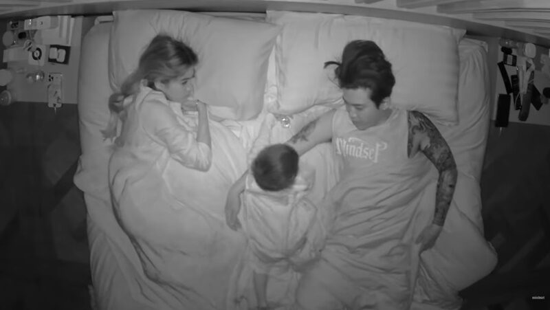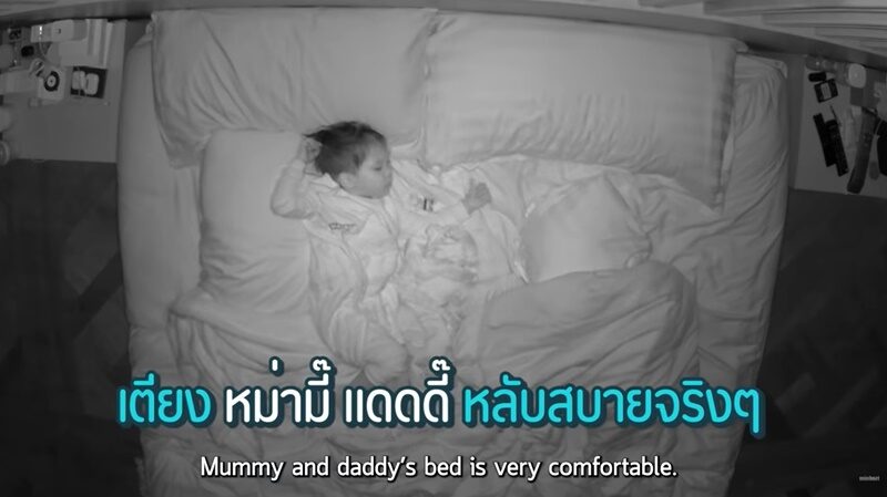 กล้องวงจรปิดเผยภาพ น้องมีก้านอนดิ้นไปมาอยู่บ่อยๆตลอดทั้งคืน แถมดิ้นมาทางหม่ามี๊เป็นส่วนใหญ่จนหม่ามี๊ตื่นตลอดแทบไม่ได้นอน รุ่งเช้ามาร์กี้ถึงกับถามลูกชายทำไมนอนดิ้นจังหลับดีไหม ลองไปฟังน้องมีก้าจะว่ายังไง