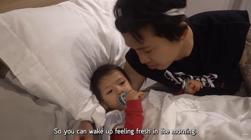 ป๊อก คุยกับลูกชายก่อนนอนว่า มีก้าไปฝึกมา 1 อาทิตย์แล้ว จะลองดูว่าเป็นยังไงบ้าง เพราะมีญ่ามานอนกับแดดดี๊หม่ามี๊จะนอนยาวถึง 7-8 โมงเช้าเลย อยากให้มีก้าหลับยาวแบบน้องด้วย โดยนอนกับแดดดี๊กับหม่ามี๊ไม่มีนม น้องมีก้าก็บอกว่ากินน้ำได้