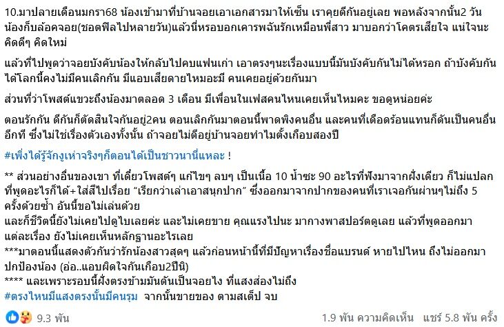 “10.มาปลายเดือนมกรา68 น้องเข้ามาที่บ้านจอยเอาเอกสารมาให้เซ็น เราคุยดีกันอยู่เลย พอหลังจากนั้น2 วันน้องก็บล็อคจอย(ชอตฟิลไปหลายวัน)แล้วนี่หรอบอกเคารพฉันรักเหมือนพี่สาว มาบอกว่าโคตรเสียใจ แน่ใจนะ คิดดีๆ คิดใหม่”