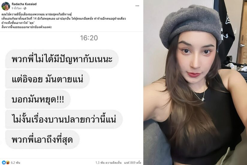 เดือดอีกงานนี้ จอย โพสต์ผ่านเฟซบุ๊กRadacha Kueaiad (กำนันจอย) เผยลักษณะเป็นแชทข้อความปริศนา ที่พูดถึง เนเงิน และ จอย บอกว่า “ไม่ได้มีปัญหากับ เน นะ แต่ อิจอย มันตายแน่ บอกมันหยุด ไม่งั้นเรื่องบานปลายกว่านี้แน่ พวกพี่เอาถึงที่สุด”