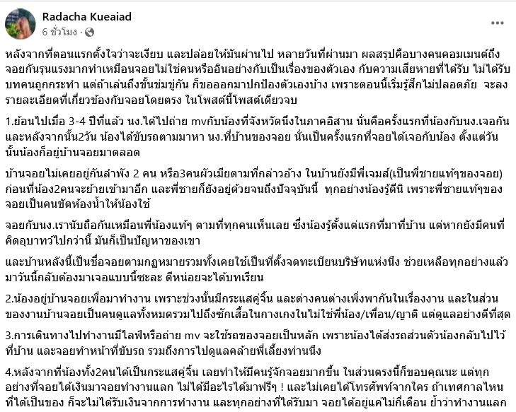 ก่อน จอย จะโพสต์เล่าเรื่องราวยาว “หลังจากที่ตอนแรกตั้งใจว่าจะเงียบ และปล่อยให้มันผ่านไป หลายวันที่ผ่านมา ผลสรุปคือบางคนคอมเมนต์ถึงจอยกันรุนแรงมากทำเหมือนจอยไม่ใช่คนหรืออินอย่างกับเป็นเรื่องของตัวเอง กับความเสียหายที่ได้รับ ไม่ได้รับบทคนถูกกระทำ แต่ถ้าเล่นถึงขั้นข่มขู่กัน ก็ขอออกมาปกป้องตัวเองบ้าง เพราะตอนนี้เริ่มรู้สึกไม่ปลอดภัย จะลงรายละเอียดที่เกี่ยวข้องกับจอยโดยตรง ในโพสต์นี้โพสต์เดียวจบ”