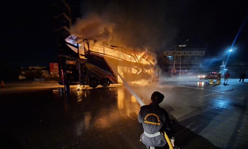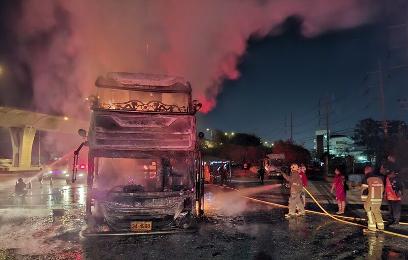 เมื่อเวลา 05.30 น. วันที่ 8 ม.ค.2569 ร.ต.ท.นพดล ทวีชาติ พนักงานสอบสวน สภ.บางปะกง พร้อมหน่วยกู้ภัยฉะเชิงเทรา และเจ้าหน้าที่ดับเพลิง ได้รับแจ้งเกิดเหตุเพลิงไหม้รถบัส 2 ชั้น บริเวณโค้งต้นสนเลยหน้าโรงพักสภ.บางปะกง ถนนบางนา-ตราด กม.47 ช่องคู่ขนาน ขาเข้ากรุงเทพ หมู่ 18 ต.บางปะกง อ.บางปะกง จ.ฉะเชิงเทรา