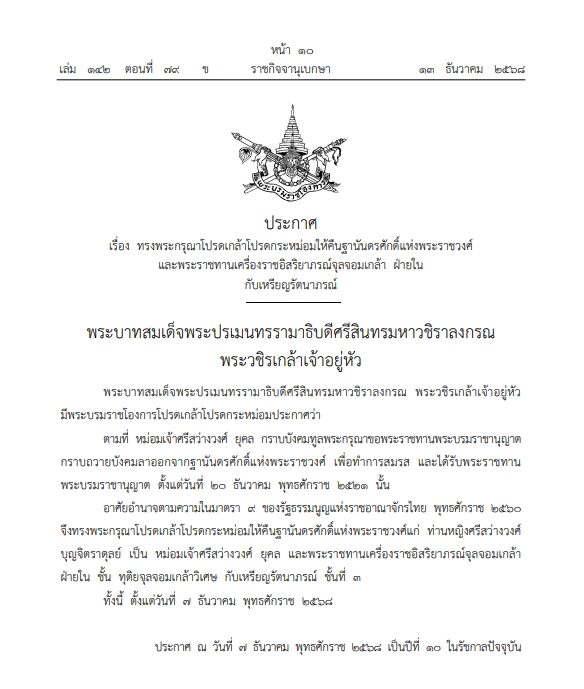 วันที่ 14 ธ.ค.2568 ผู้สื่อข่าวรายงานว่า เว็บไซต์ ราชกิจจานุเบกษา เผยแพร่ประกาศ เรื่อง ทรงพระกรุณาโปรดเกล้าฯ ให้คืนฐานันดรศักดิ์แห่งพระราชวงศ์และพระราชทานเครื่องราชอิสริยาภรณ์จุลจอมเกล้า ฝ่ายใน กับเหรียญรัตนาภรณ์ ความว่า