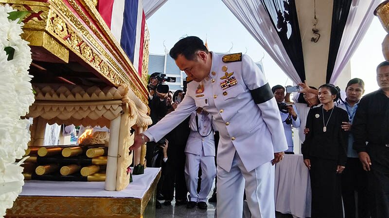 โดยนายอนุรัตน์ ธรรมประจำจิต ผู้ว่าราชการจังหวัดศรีสะเกษ ได้ขึ้นวางผ้าไตรพระราชทานเปิดงาน จากนั้นแขกผู้มีเกียรติทยอยขึ้นวางผ้าไตร ณ เมรุวัดกลาง ท่ามกลางความอาลัยของครอบครัว ผู้บังคับบัญชา เพื่อนทหาร และประชาชนจำนวนมาก