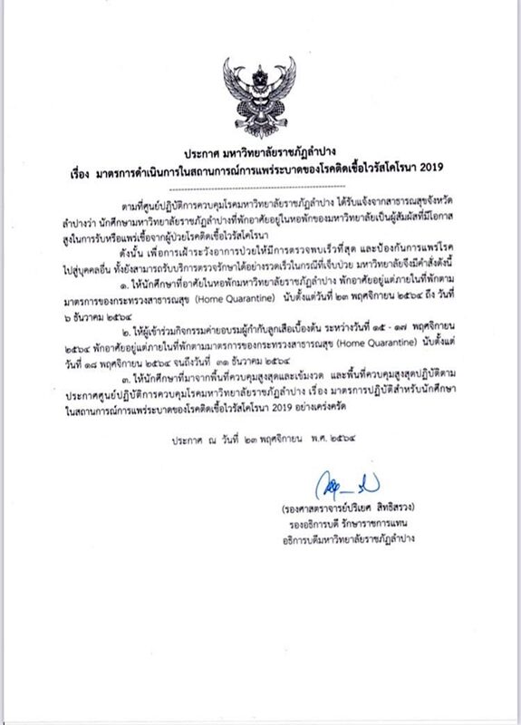ม.ราชภัฏลำปาง พบ นักศึกษาติดโควิด 1 ราย ประกาศให้นักศึกษาในหอพักกักตัว 14 วัน และผู้เข้าร่วมกิจกรรมค่ายลูกเสือ กักตัวในที่พักถึงสิ้นปีนี้
