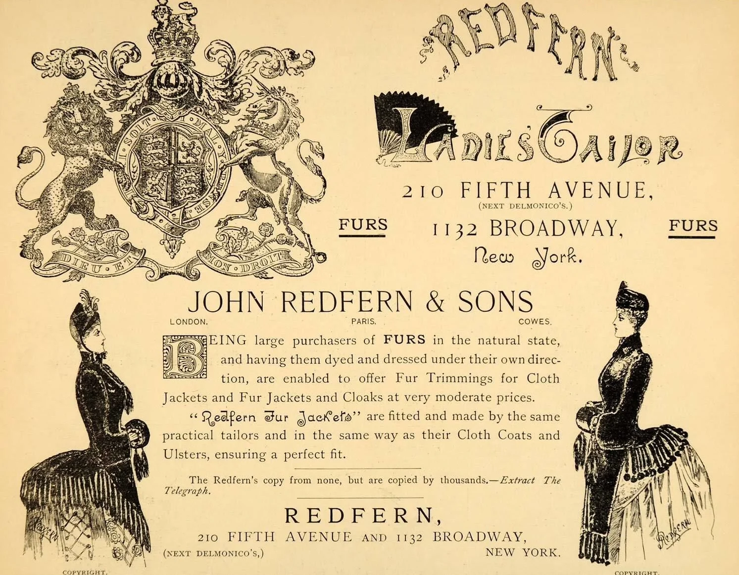 ภาพโฆษณาคอลเล็กชั่นใหม่ร้านของเรดเฟิร์น (Advertisement for Redfern's newest collection), from the New York Tribune, circa 1885.