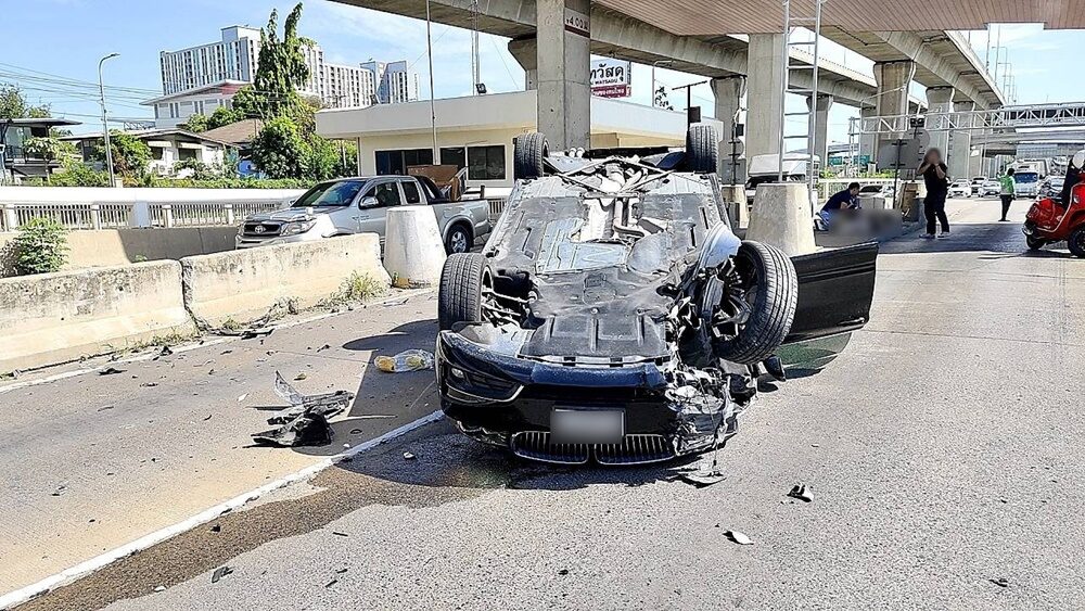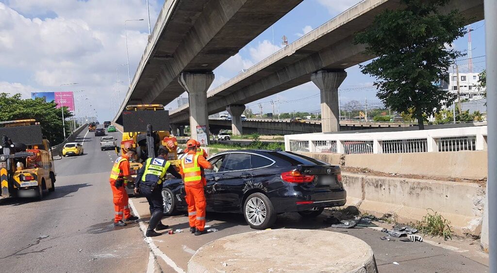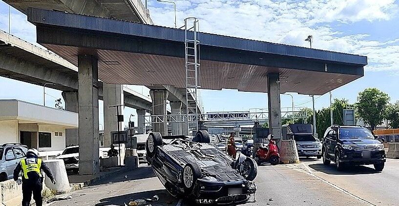 บีเอ็ม ขับมา 40 กม.เข้า ด่านเก็บเงินร้าง เหม่อแป๊บเดียว เสยเสาปูนพลิกหงายท้อง
