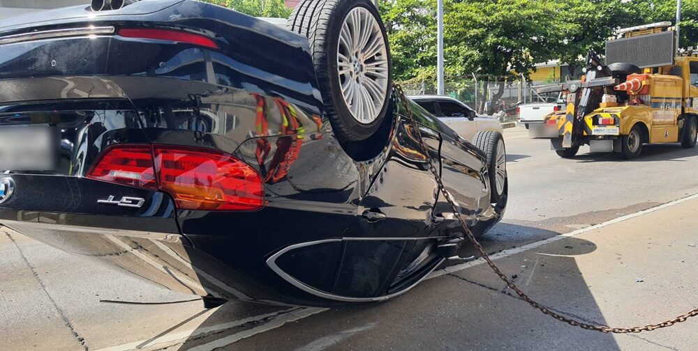 เก๋งบีเอ็ม ขับมา 40 กม.เข้าด่านเก็บเงินร้าง เผลอละสายตาแป๊บเดียว รถชนเสาปูนหน้าด่าน พลิกหงายท้องล้อชี้ฟ้า มีผู้ได้รับบาดเจ็บ 1 ราย