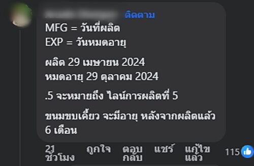 ต่อมาได้มีผู้เข้ามาเฉลยเป็นความรู้ใหม่ให้หลายคนหายสงสัย คือ "MFG = วันที่ผลิต EXP = วันหมดอายุ ผลิต 29 เมษายน 2024 หมดอายุ 29 ตุลาคม 2024 .5 จะหมายถึง ไลน์การผลิตที่ 5 ขนมขบเคี้ยว จะมีอายุ หลังจากผลิตแล้ว 6 เดือน"