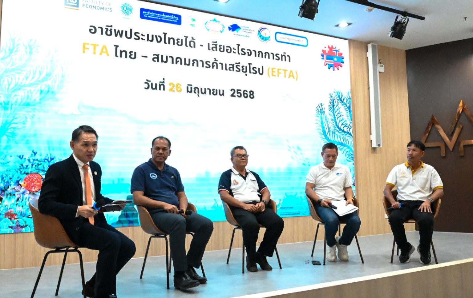 คณะเศรษฐศาสตร์ และคณะประมง มหาวิทยาลัยเกษตรศาสตร์ ร่วมกับ 6 องค์กรด้านการประมง ได้แก่ สมาคมสมาพันธ์การเพาะเลี้ยงสัตว์น้ำไทย สมาคมผู้เพาะเลี้ยงปลาไทย สมาคมผู้เพาะเลี้ยงปลาทะเลไทย สมาคมปลานิลไทย ชมรมผู้ผลิตลูกพันธุ์สัตว์น้ำไทย และแปลงใหญ่ปลานิลชลบุรี ได้จัดอภิปรายงานประชุมเสวนาภายใต้หัวข้อ “อาชีพประมงไทยได้-เสียอะไรจากการทำ FTA ไทย – สมาคมการค้าเสรียุโรป (EFTA)” ในวันที่ 26 มิถุนายน 2568 ณ คณะเศรษฐศาสตร์ มหาวิทยาลัยเกษตรศาสตร์ เวลา 9.00-12.00น. โดยมีวัตถุประสงค์เพื่อให้เกิดการแลกเปลี่ยนเรียนรู้และหาแนวทางแก้ไขในเชิงรุกของการเปิดการค้าเสรีของสินค้าประมงที่ส่งผลกระทบต่อเกษตรกรผู้เพาะเลี้ยงสัตว์น้ำในปัจจุบันและในอนาคต