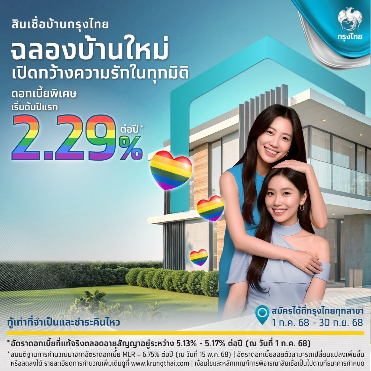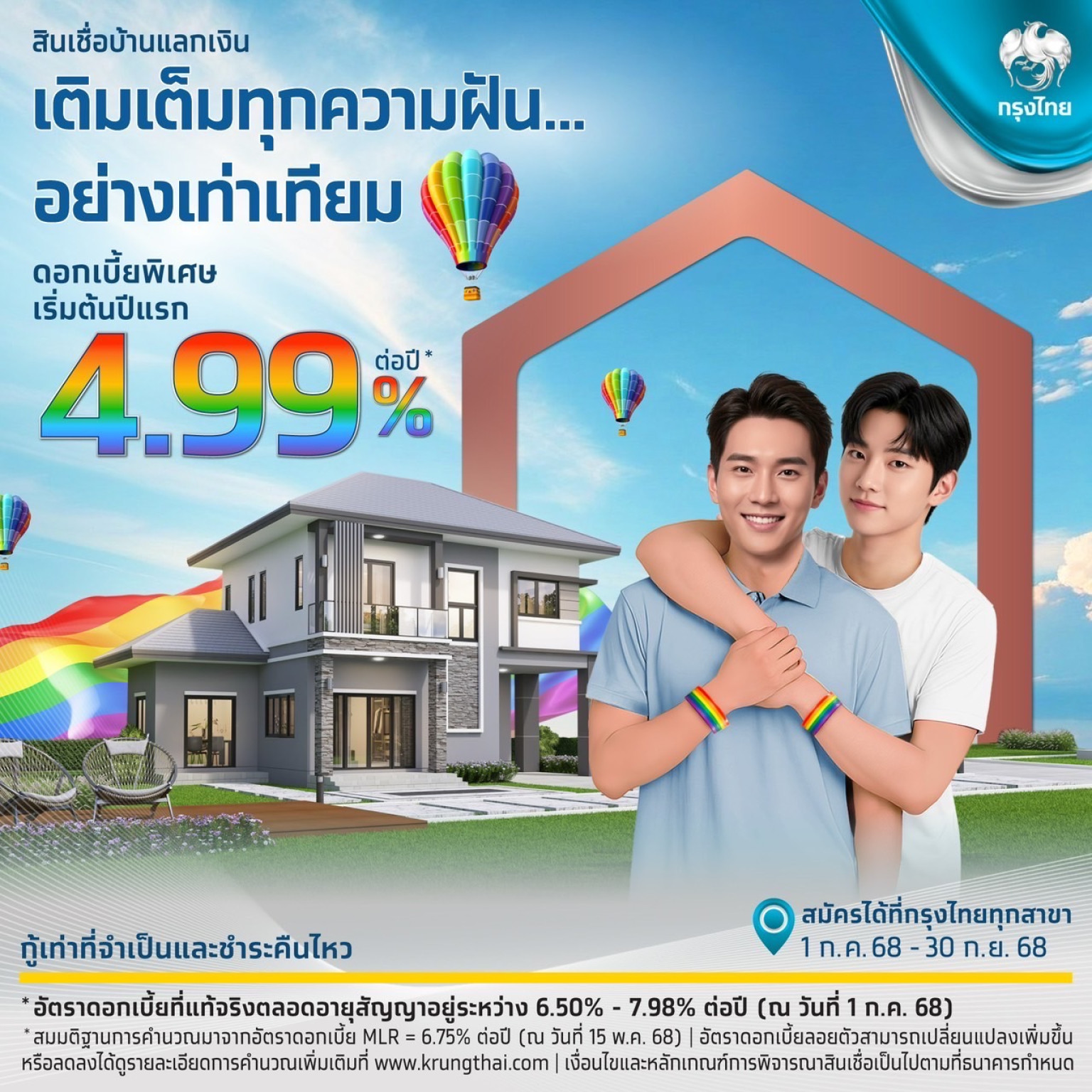 โดยธนาคารกรุงไทย ยึดมั่นในแนวทางการให้สินเชื่ออย่างรับผิดชอบและเป็นธรรม (Responsible Lending) ของธนาคารแห่งประเทศไทย พร้อมให้ความรู้ สร้างวินัยทางการเงิน กู้เท่าที่จำเป็นและชำระคืนไหว เพื่อเสริมสร้าง ภูมิคุ้มกันทางการเงิน สร้างความมั่นคงและอิสระทางการเงินอย่างยั่งยืน สินเชื่อกรุงไทยบ้านแลกเงิน อัตราดอกเบี้ยที่แท้จริงตลอดอายุสัญญาอยู่ระหว่าง 6.50%-7.98% ต่อปี (ณ วันที่ 1 ก.ค. 68) สินเชื่อบ้านกรุงไทย อัตราดอกเบี้ยที่แท้จริงตลอดอายุสัญญาอยู่ระหว่าง 5.13% - 5.17% ต่อปี (ณ วันที่ 1 ก.ค. 68) สมมติฐานการคำนวณมาจากอัตราดอกเบี้ย MLR = 6.75% ต่อปี (ณ วันที่ 15 พ.ค. 68) อัตราดอกเบี้ยลอยตัวสามารถเปลี่ยนแปลงเพิ่มขึ้นหรือลดลงได้ รายละเอียดการคำนวณเพิ่มเติมดูที่ www.krungthai.com เงื่อนไขและหลักเกณฑ์การพิจารณาสินเชื่อเป็นไปตามที่ธนาคารกำหนด