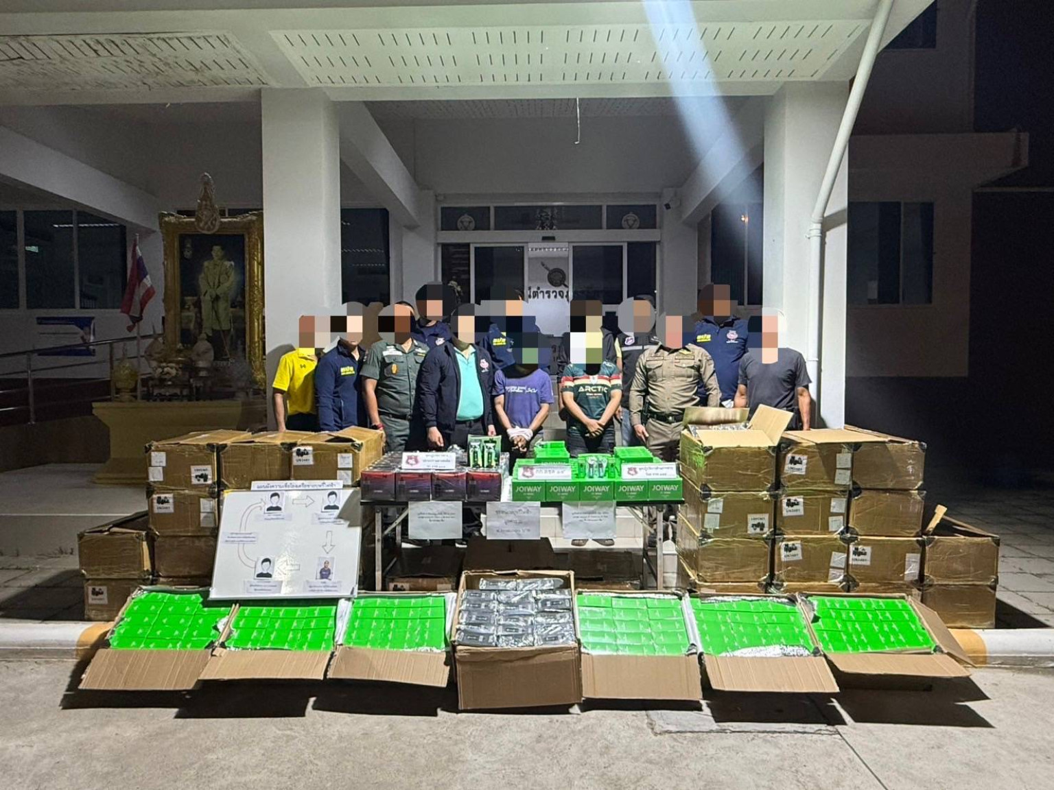 ร่วมกันจับกุม นายเนติพงษ์ หรือต้น อายุ 27 ปี หนุ่มสุพรรณบุรี และนางสาววรรณนิภา หรืออิ๋ว อายุ 27 ปี สาวสกลนคร ได้ที่บริเวนริมถนนพระราม 2 ขาขึ้น กทม. เลยร้านตุ๊กตาปราณี 200 เมตร หมู่ 6 ต.แพรกหนามแดง อ.อัมพวา จ.สมุทรสงคราม พร้อมของกลาง : รถยนต์ ยี่ห้อ TOYOTA รุ่น VIGO สีบรอนเงิน หมายเลขทะเบียน บว xxx สุพรรณบุรี ,โทรศัพท์มือถือ 1 เครื่อง ,บุหรี่ไฟฟ้าสำเร็จแบบสูบแล้วทิ้ง ยี่ห้อ JOIWAY แบบสูบ 12,000คำ จำนวน 36 ลัง ลังละ 300 ชิ้น รวม 10,800 ชิ้น ราคาชิ้นละ 40] บาท รวมเป็นเงิน 4,320,000บาท ,บุหรี่ไฟฟ้าสำเร็จแบบสูบแล้วทิ้ง ยี่ห้อ M ZERO แบบสูบ 9,000คำ จำนวน 2 ลัง ลังละ 360 ชิ้น รวม 720 ชิ้น ราคาชิ้นละ 400 บาท รวมเป็นเงิน 288,000 บาท