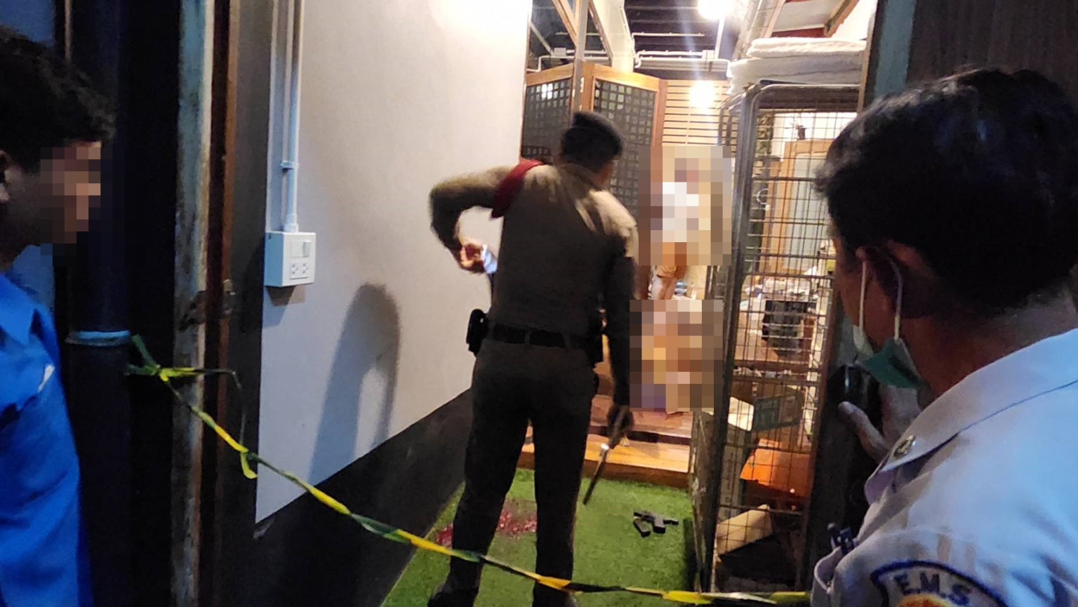 จากการตรวจสอบในที่เกิดเหตุพบอาวุธปืนขนาด 9 มม.ตกอยู่ข้างตัว ปลอกกระสุนปืน 1 ปลอก หัวกระสุนปืน 1 หัว จึงได้เก็บไว้เป็นหลักฐาน ทราบชื่อต่อมานายเกล้าชัย อายุ 45 ปี บ้าน หมู่ 10 ต.ดอนตะโก อ.เมือง จ.ราชบุรี บาดแผลถูกกระสุนปืนยิงเข้าบริเวณหลังกกหูด้านซ้ายกระสุนทะลุด้านขวา อาการสาหัสซึ่งแพทย์ได้เร่งทำการรักษา