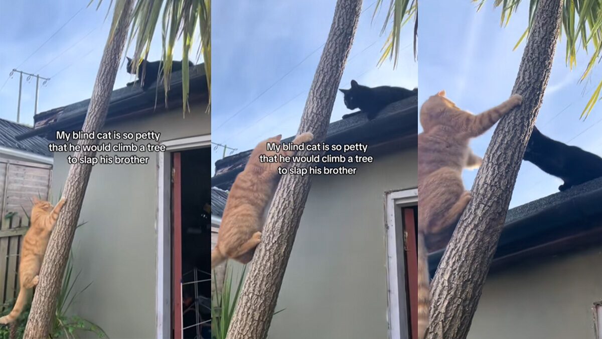 เลือดมันร้อน! ไวรัลแมวส้มห้าว ถึงตาจะมองไม่เห็นก็ยังปีนต้นไม้ ขึ้นไปต่อยพี่ชายบนหลังคาอย่างเซียน