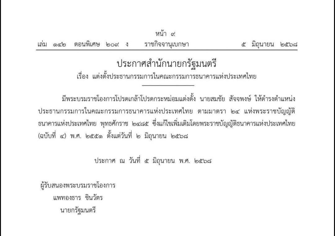 มีพระบรมราชโองการโปรดเกล้าโปรดกระหม่อมแต่งตั้ง นายสมชัย สัจจพงษ์ ให้ดำรงตำแหน่งประธานกรรมการในคณะกรรมการธนาคารแห่งประเทศไทย ตามมาตรา 24 แห่งพระราชบัญญัติธนาคารแห่งประเทศไทย พุทธศักราช 2485 ซึ่งแก้ไขเพิ่มเติมโดยพระราชบัญญัติธนาคารแห่งประเทศไทย (ฉบับที่ 4) พ.ศ. 2551 ตั้งแต่วันที่ 2 มิถุนายน 2568