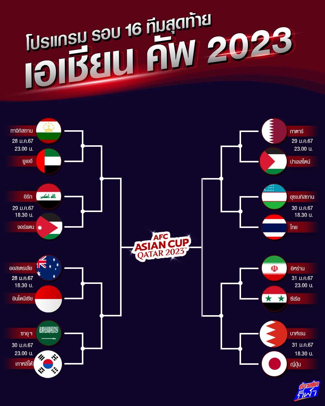 สรุป โปรแกรม ฟุตบอล เอเชียน คัพ รอบ 16 ทีมสุดท้าย ใครเจอใคร เตะวันไหน