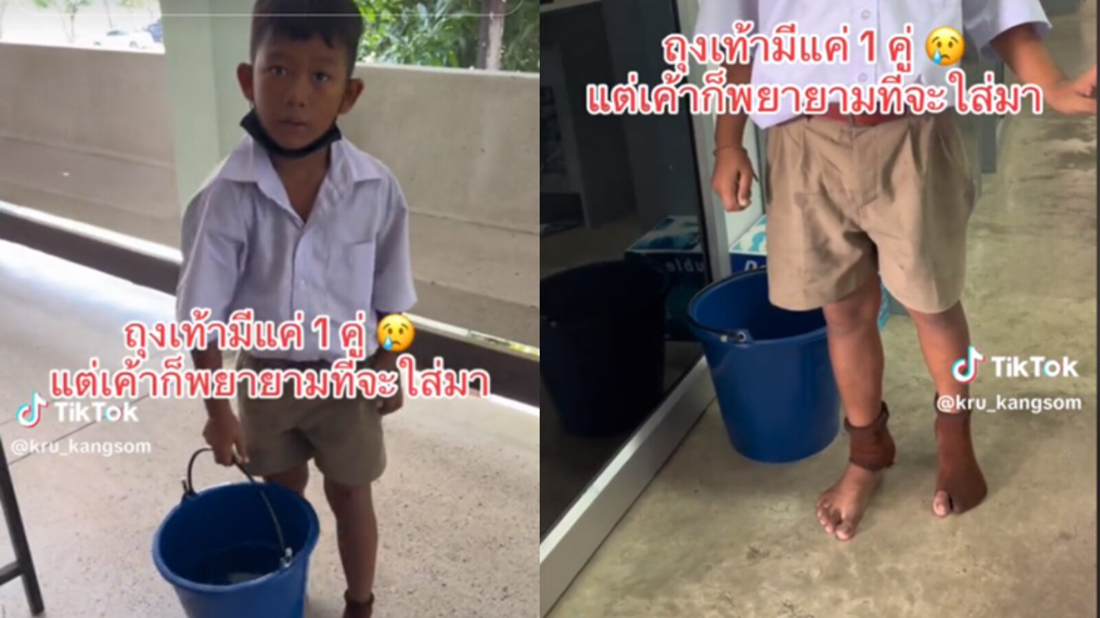 โอกาสเราไม่เท่ากัน! เด็กชายวัยประถมที่บ้านมีถุงเท้าแค่คู่เดียว สภาพขาดหลายรู เผยนี่คือคู่ที่ดีที่สุดแล้ว ชาวเน็ตแห่ขอที่อยู่ ร่วมส่งน้ำใจ