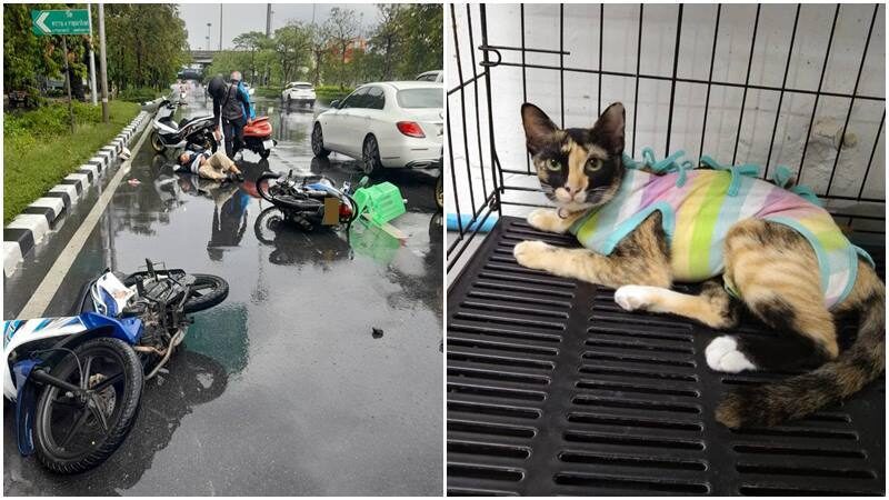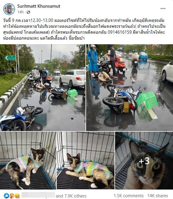 วันที่ 10 ก.ค. 66 ผู้สื่อข่าวรายงานว่า ผู้ใช้เฟซบุ๊กชื่อSuritmatt Khunsamut โพสต์ขอความช่วยเหลือ หลังเกิดเหตุคนขับมอเตอร์ไซค์ที่บรรทุกแมวตัวหนึ่งไว้ในกล่องด้านหลัง แล้วประสบอุบัติเหตุ จนทำให้แมวหลุดหาย จนต้องประกาศตามหา