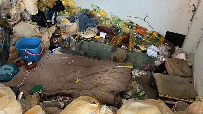 นอกจากนี้ยังพบขวดน้ำที่ใส่น้ำปัสสาวะกองเรียงเป็นแถวรวมถึงกองปะปนอยู่ในกองขยะอีกจำนวนมาก และภายในห้องยังมีกรงนกที่สภาพเก่าและส่งกลิ่นเหม็นโชยอย่างรุนแรงจนทำให้มีแมลงสาบเดินไต่ยั้วเยี้ยเต็มพื้นห้อง