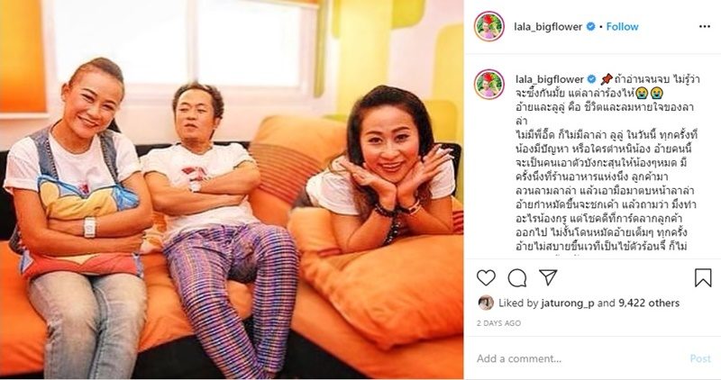 ออกจากอก7ปีไม่ได้เจอไม่ได้คุยร่ำไห้สู่อ้อมกอดพี่อีกครั้ง - ลาล่า ลูลู่ อาร์สยาม หลังออกจากอก อี๊ด โปงลางฯ ไปประมาน 7 ปี นานแล้วที่ไม่ค่อยได้เจอ ไม่ได้คุยกันเลย ล่าสุด ทั้งคู่โพสต์ภาพและคลิปกลับสู่อ้อมกอดพี่ชาย โดย ลาล่า โพสต์ภาพ 3 คน พร้อมบอกว่า “ถ้าอ่านจนจบ ไม่รู้ว่าจะซึ้งกันมั้ย แต่ลาล่าร้องไห้