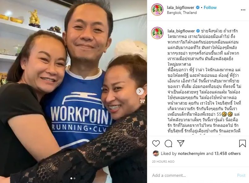 ขณะที่ ลูลู่ ก็โพสต์ภาพและคลิปเช่นกัน พร้อมเผยว่า “ไม่รู้จะเริ่มต้นพูดยังไงดี เพราะมันตื้นตันและดีใจที่สุดที่เราได้มาหากัน ได้มาคุย ได้มาเล่าทุกๆอย่างให้พี่ชายคนนี้ได้ฟัง. นานแค่ไหน จำได้ว่า ออกจากอกพี่ชายคนนี้มาก็ประมาน 7 ปี แล้ว ที่เราไม่ค่อยได้เจอ ไม่ได้คุยกันเลย แต่มาวันนี้มันทำให้น้องคนนี้รู้ว่า พี่ชายคนนี้ยังห่วงน้องเสมอ มองดูอยู่ห่างๆ คอยให้กำลังใจน้องตลอดมา