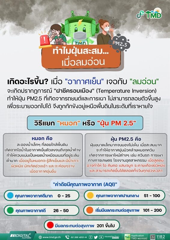 กรมอุตุฯ มีคำตอบ เกิดอะไรขึ้น เมื่อ "อากาศเย็น" เจอกับ "ลมอ่อน" จะเกิดปรากฏการณ์ "ฝาชีครอบเมือง" เผย วิธีแยก "หมอก" หรือ "ฝุ่น PM2.5"