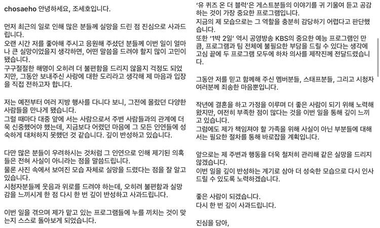 โจเซโฮ พิธีกรดัง ถอนตัว 2 รายการ หลังมีกระแสข่าวลือเชื่อมโยงชื่อกับคนในขบวนการอาชญากรรม ยันไม่ใช่เรื่องจริง - ขอโทษแฟนๆ ทำให้ผิดหวัง ยกเป็นบทเรียนครั้งสำคัญ
