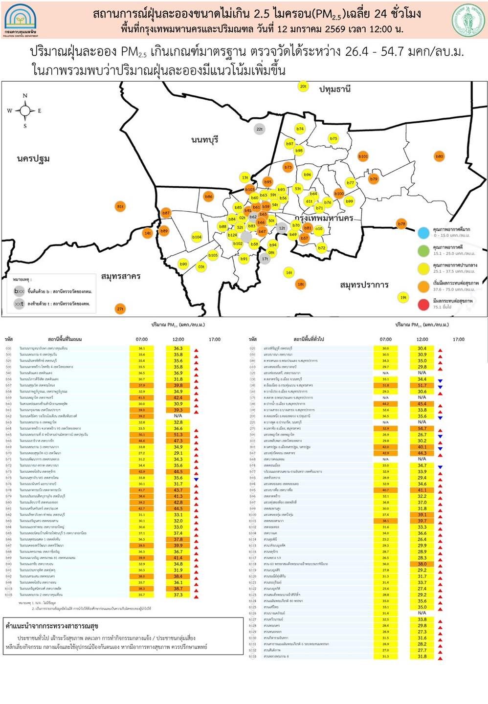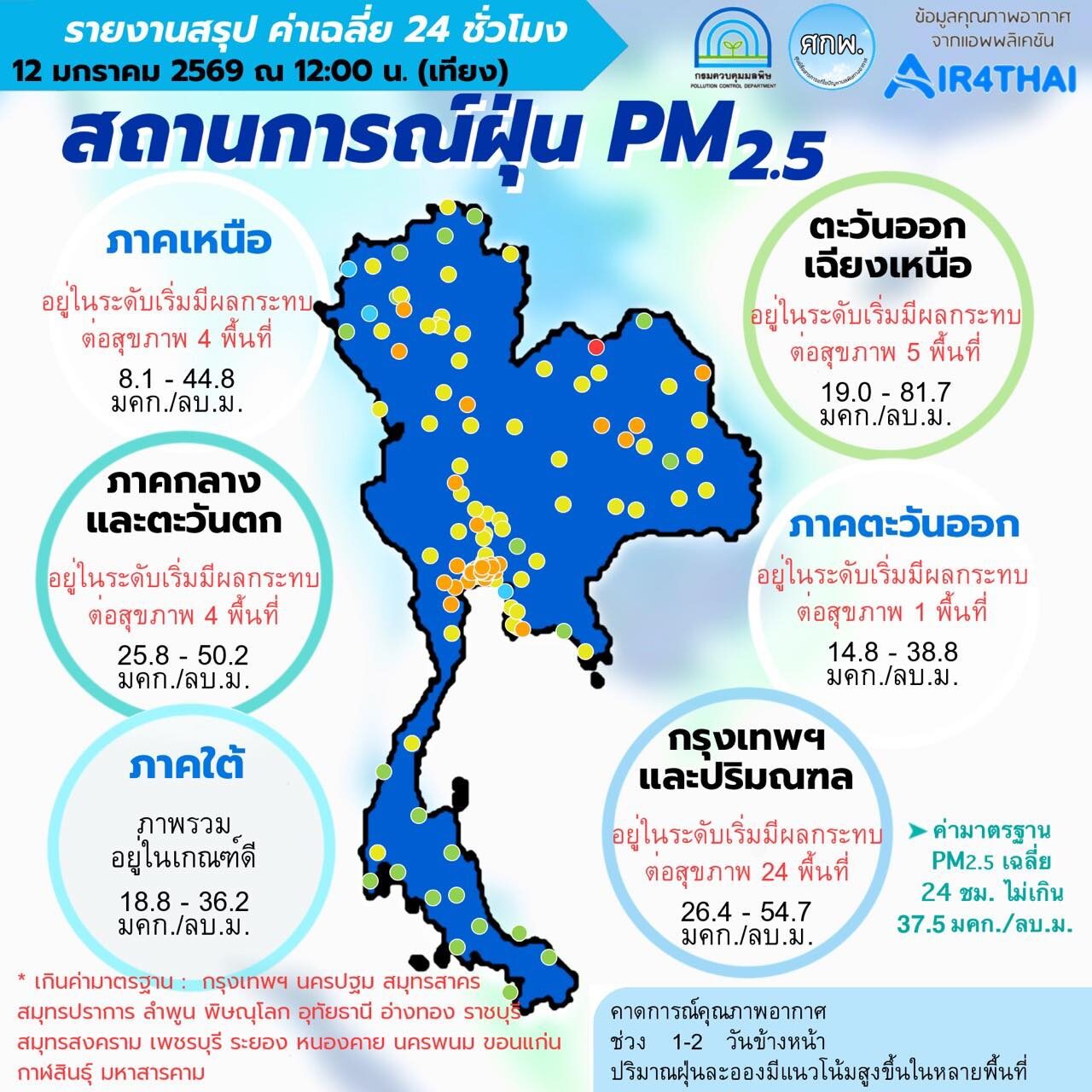 เมื่อเวลา 12.00 น. วันที่ 12 ม.ค.2569 ศูนย์สื่อสารการแก้ไขปัญหามลพิษทางอากาศ (ศกพ.) กรมควบคุมมลพิษ (คพ.) รายงานการติดตามตรวจสอบคุณภาพอากาศ ภาพรวมปริมาณฝุ่นละอองขนาดเล็กไม่เกิน 2.5 ไมครอน หรือ PM2.5 ในประเทศอยู่ในเกณฑ์มาตรฐานเป็นส่วนใหญ่ ตรวจวัดค่าเฉลี่ย 24 ชม. วัดค่าฝุ่นได้ระหว่าง 6.7 – 81.7 ไมโครกรัมต่อลูกบาศก์เมตร (มคก./ลบ.ม.) ค่ามาตรฐานไม่เกิน 37.5 มคก./ลบ.ม.