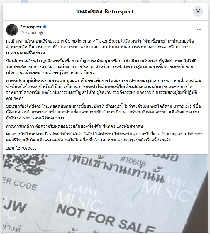 ภาพที่ปรากฏนี้เป็นหนึ่งในภาพจากบุคคลที่เป็นกรณีที่มีการโพสต์ประกาศขายบัตรรูปแบบดังกล่าวบนสื่อออนไลน์ ทั้งที่บนตัวบัตรระบุข้อห้ามไว้อย่างชัดเจน การกระทำในลักษณะนี้ไม่เพียงสร้างความเสียหายต่อระบบการจัดจำหน่ายบัตรเท่านั้น แต่ยังเพิ่มภาระและปัญหาให้กับผู้จัดงาน รวมถึงกระทบต่อความเป็นธรรมของผู้ชมที่ปฏิบัติตามกติกา
