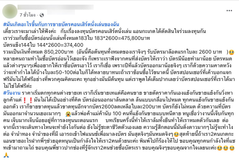 กลายเป็นกรณีที่ได้รับความสนใจอย่างมากบนโซเชียลมีเดีย เมื่อมีผู้ใช้สื่อสังคมออนไลน์รายหนึ่ง โพสต์เล่าถึงการลงทุนซื้อบัตรคอนเสิร์ตเพื่อนำมาขายต่อ โดยลงทุนรับซื้อบัตรรวมกันกว่า 300 ใบ ใช้เงินร่วม 850,000 บาท จนกระทั่งเริ่มเจอปัญหาเทขายตัดราคากันเองในบรรดาพ่อค้า-แม่ค้า และมีปัญหาเรื่องของหนี้สินจากการจำนำ การนำรถเข้าไฟแนนซ์เพื่อนำมาลงทุน