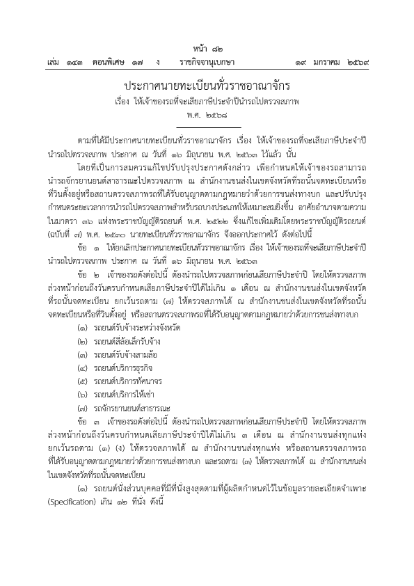 อาศัยอำนาจตามความในมาตรา 36 แห่งพระราชบัญญัติรถยนต์ พ.ศ. 2522 ซึ่งแก้ไขเพิ่มเติมโดยพระราชบัญญัติรถยนต์ (ฉบับที่ 7) พเศ. 2530 นายทะเบียนทั่วราชอาณาจักร จึงออกประกาศไว้ ดังต่อไปนี้