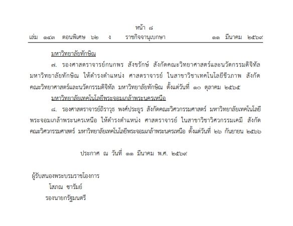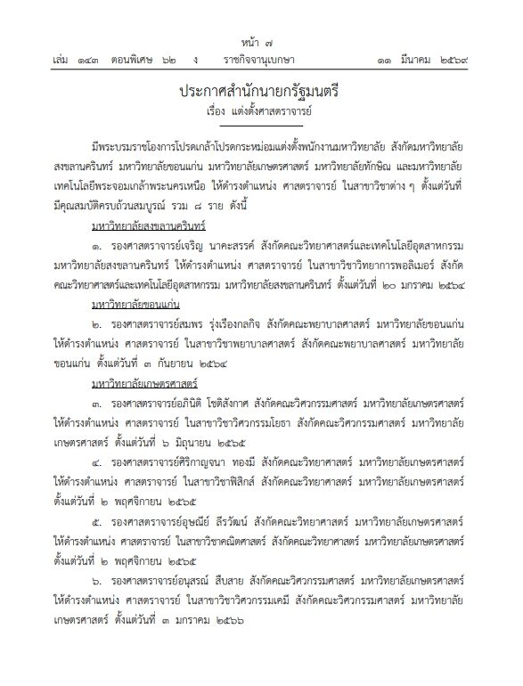 สังกัดมหาวิทยาลัยสงขลานครินทร์ มหาวิทยาลัยขอนแก่น มหาวิทยาลัยเกษตรศาสตร์ มหาวิทยาลัยทักษิณ และ มหาวิทยาลัยเทคโนโลยีพระจอมเกล้าพระนครเหนือ ให้ดำรงตำแหน่ง ศาสตราจารย์ ในสาชาวิชาต่าง ๆ ตั้งแต่วันที่มีคุณสมบัติครบถ้วนสมบูรณ์ รวม 8 ราย ดังนี้