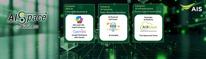 AIS พร้อมเป็นมากกว่าผู้ให้บริการเทคโนโลยี แต่เป็นพันธมิตรเชิงกลยุทธ์ที่ทำให้ AI เกิดประโยชน์ได้จริง โดย AISpace คือศูนย์รวม AI ที่เชื่อมกับโครงข่ายอัจฉริยะของ AIS เพื่อให้ ลูกค้าทั่วไป เข้าถึงและเริ่มใช้งาน AI ได้ง่าย คุ้มค่า และปลอดภัย ขณะเดียวกันก็รองรับ ลูกค้าองค์กร ด้วยโซลูชันที่ช่วยเพิ่มประสิทธิภาพงาน ยกระดับประสบการณ์ลูกค้า และเสริมโครงสร้างพื้นฐานดิจิทัลอย่างมั่นคง เราเชื่อว่า AI ไม่ได้มาแทนที่คน แต่ช่วยยกระดับศักยภาพการทำงาน และ AIS พร้อมขับเคลื่อน AI Ecosystem ของไทย ให้เติบโตอย่างยั่งยืน ด้วยมาตรฐานความปลอดภัยที่เชื่อถือได้สำหรับคนไทยและภาคธุรกิจ