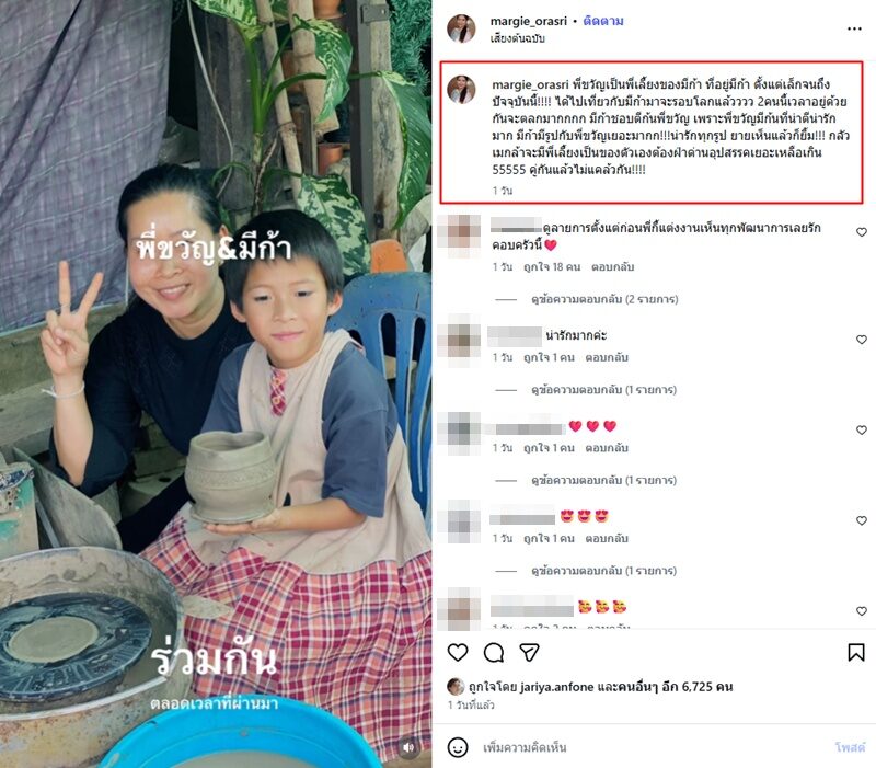 “มีก้ามีรูปกับพี่ขวัญเยอะมากก!!!น่ารักทุกรูป ยายเห็นแล้วก็ยิ้ม!!! กลัวเมกล้าจะมีพี่เลี้ยงเป็นของตัวเองต้องฝ่าด่านอุปสรรคเยอะเหลือเกิน 55555 คู่กันแล้วไม่แคล้วกัน!!!!”