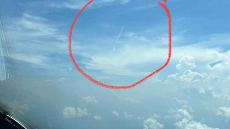 เมื่อเครื่องบินของตนอยู่ที่ความสูงประมาณ 5,000 - 6,000 ฟุต ก็สังเกตเห็นว่ามีบั้งไฟพุ่งขึ้นมาด้วยความเร็วและความสูงน่าจะพุ่งทะลุไปถึง 8,000 ฟุต ห่างจากเครื่องบินไม่ถึง 300 เมตร ตอนนั้นตนได้หยิบกล้องจากโทรศัพท์มือถือมาถ่ายไว้เป็นหลักฐาน เพื่อนำส่งให้หน่วยงานที่เกี่ยวข้อง