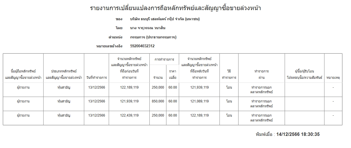 วันที่ 14 ธันวาคม 2566 สำนักงานคณะกรรมการกำกับหลักทรัพย์และตลาดหลักทรัพย์ (ก.ล.ต.) รายงานข้อมูลแบบรายงานการเปลี่ยนแปลงการถือหุ้นของผู้บริหาร (แบบ 59) โดยนางจารุวรรณ วนาสิน ประธานกรรมการ บริษัท ธนบุรี เฮลท์แคร์ กรุ๊ป จํากัด (มหาชน) หรือ THG
