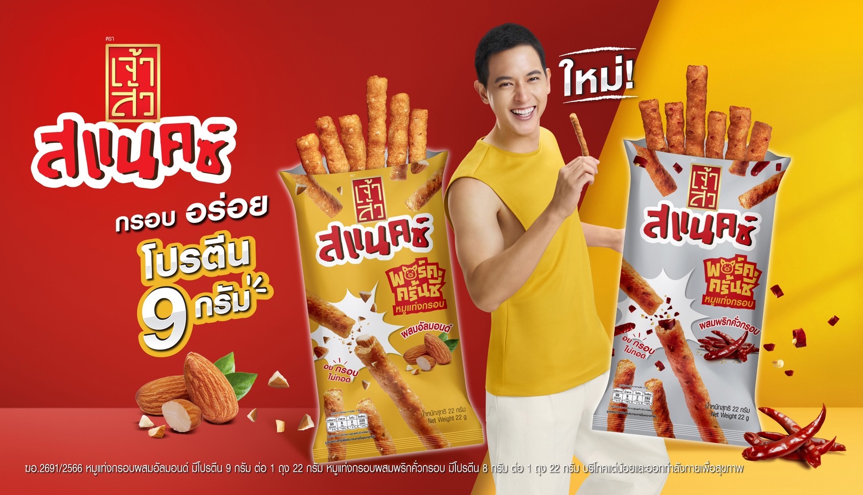 “เจ้าสัว” สร้างปรากฏการณ์สะเทือนวงการสแน็ค เปิดตัวแบรนด์ย่อย (Sub-brand) “เจ้าสัว สแนคซ์” ประเดิมด้วย “พอร์ค ครั้นชี่ หมูแท่งกรอบ” (Pork Crunchy) นวัตกรรมล่าสุดที่หมูแท่งกรอบผสมด้วยอัลมอนด์และพริกคั่วกรอบ เสริมความลีนด้วยโปรตีนสูงสุด 9 กรัม ตอกย้ำความเป็นเจ้าตลาดแห่งโปรตีนสแน็ค ตอบรับไลฟ์สไตล์คนรุ่นใหม่เลือกทานของอร่อยที่มีประโยชน์ ตั้งเป้าครองแชมป์ตลาดขนมขบเคี้ยวจากเนื้อสัตว์ (Meat snack) พร้อมพาตลาดนี้ให้เติบโตขึ้นกว่า 50%