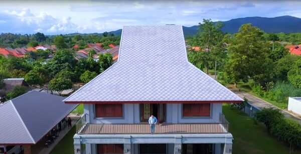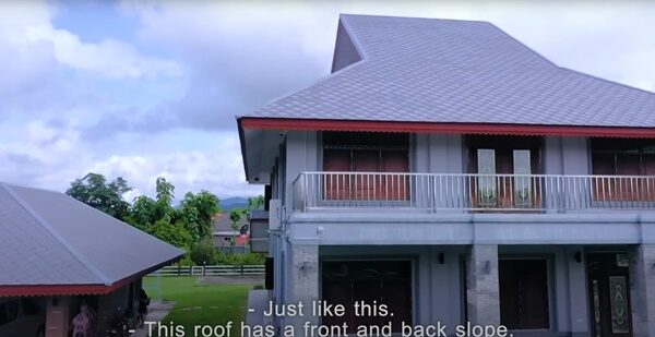 เรียกว่างานนี้ อ.ธนวันต์ พาทัวร์ทุกมุมของบ้าน พร้อมอธิบายว่าหลังคาของบ้านสร้างเป็น ‘ทรงปันหยา’ หรือแบบเทหน้าเทหลัง เชื่อกันว่าทรัพย์จะตกจากหน้าบ้านและหลังบ้าน
