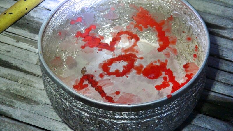 ต่อมาอาจารย์เริง ก็หยดน้ำตาเทียนลงในขันธ์น้ำ เลขตัวแรกคือเลข 7, 5, 6 และเลข 0 กับ เลข 2 นักเสี่ยงโชคไม่รอช้าต่างนำโทรศัพท์มือถือมาถ่ายเพื่อนำเลขไปเสี่ยงโชค ส่วนตัวเลขก็มองต่างกันไปและนำไปจับคู่เอาเอง ส่วนอาจารย์เริง ได้นำตัวเลขดังกล่าวเขียนใส่ลงแผ่นกระดาษ 705 และ 29