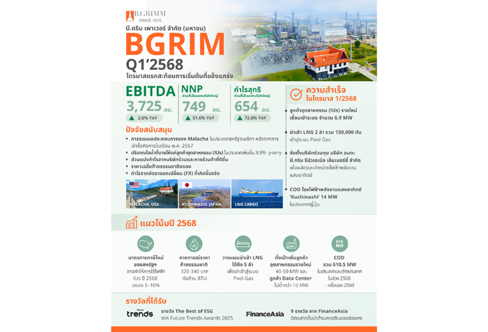 ดร. ฮาราลด์ ลิงค์ ประธานเจ้าหน้าที่บริหารกลุ่ม บริษัท บี.กริม เพาเวอร์ จำกัด (มหาชน) หรือ BGRIM เปิดเผยว่า ผลประกอบการไตรมาสที่ 1 ปี 2568 เติบโตอย่างแข็งแกร่งด้วยกำไรสุทธิจากการดำเนินงาน (NNP) – ส่วนที่เป็นของบริษัทใหญ่เพิ่มขึ้น 51.6% สู่ระดับ 749 ล้านบาท และ EBITDA 3,725 ล้านบาท เติบโต 2.6% เมื่อเทียบจากช่วงเดียวกันของปีก่อน ขณะที่กำไรสุทธิ – ส่วนที่เป็นของบริษัทใหญ่อยู่ที่ 654 ล้านบาท เพิ่มขึ้นจาก 379 ล้านบาทในช่วงเดียวกันของปีก่อน จาก 5 ปัจจัยหลักได้แก่ 1.การรวมผลประกอบการของ Malacha ในประเทศสหรัฐ อเมริกา หลังจากเข้าซื้อกิจการ 100% ในเดือนพฤษภาคม 2567 2.ปริมาณไอน้ำที่ขายให้แก่ลูกค้าอุตสาหกรรม (IUs) ในประเทศเพิ่มขึ้น 8.8% จากช่วงเดียวกันของปีก่อน 3.ส่วนแบ่งกำไรจากบริษัทร่วมและการร่วมค้าที่ดีขึ้น 4.การลดลงของราคาก๊าซธรรมชาติ และ 5. กำไรจากอัตราแลกเปลี่ยน (FX) ที่เกิดขึ้นจริง