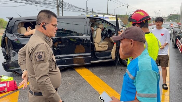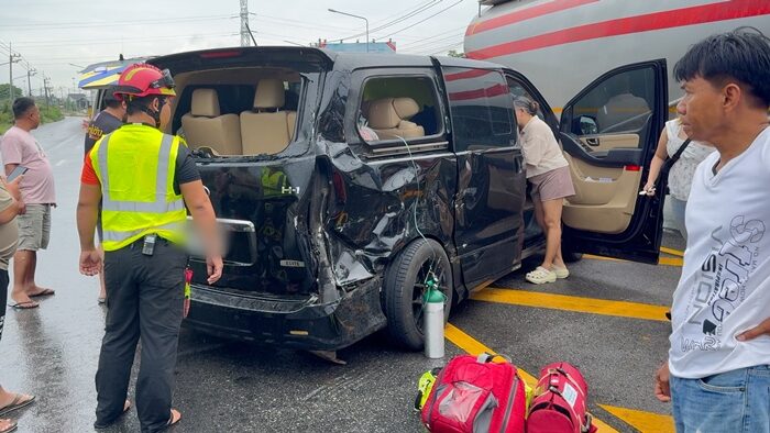 รถตู้ฮุนได กลับจากทำบุญขึ้นบ้านใหม่ กลับรถตัดหน้า 18 ล้อ เบรกไม่ทันพุ่งชนเต็มแรงพังเสียหาย บาดเจ็บ 5 ราย เจ้าหน้าที่เร่งลงพื้นที่ให้การช่วยเหลือ