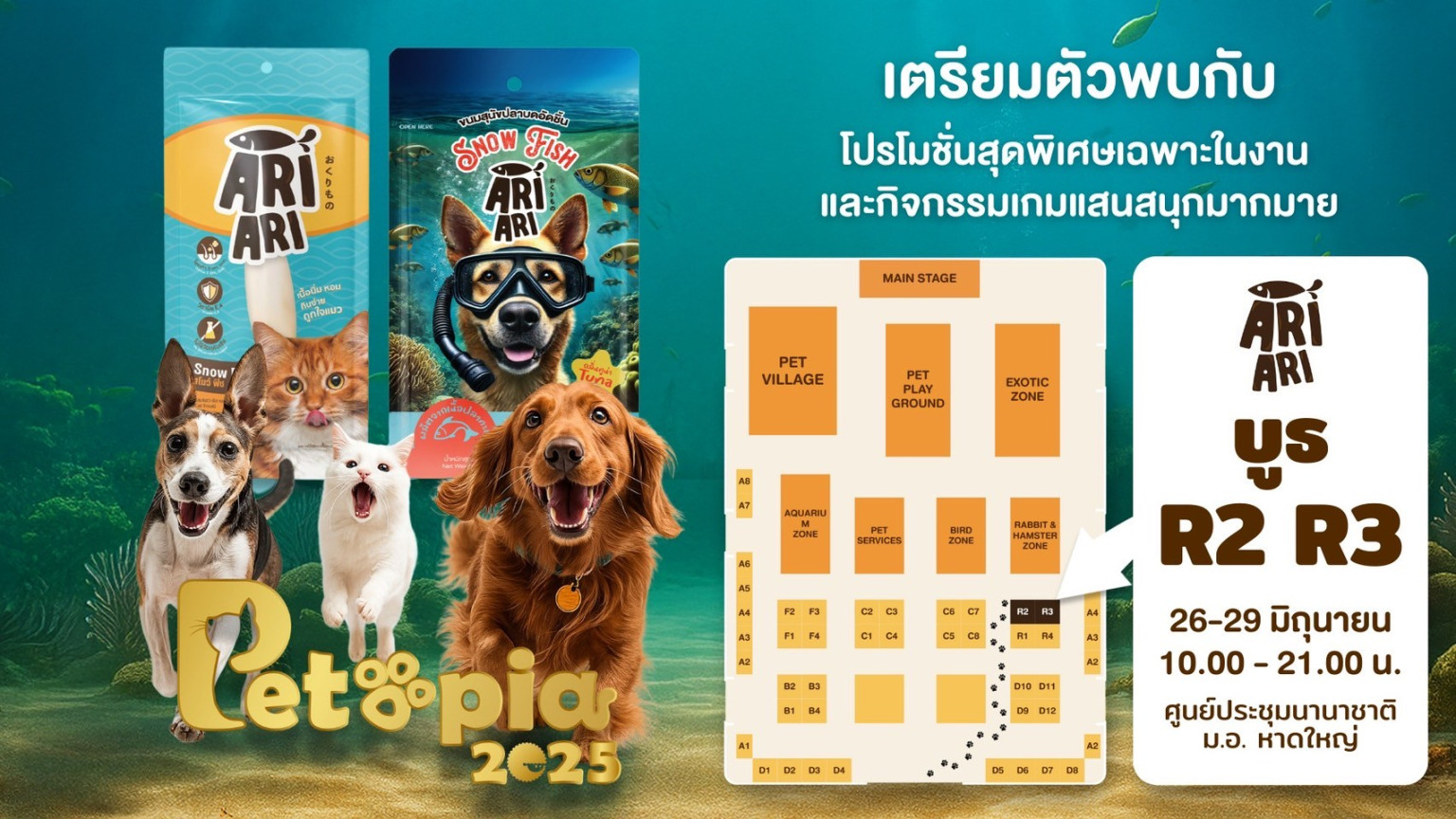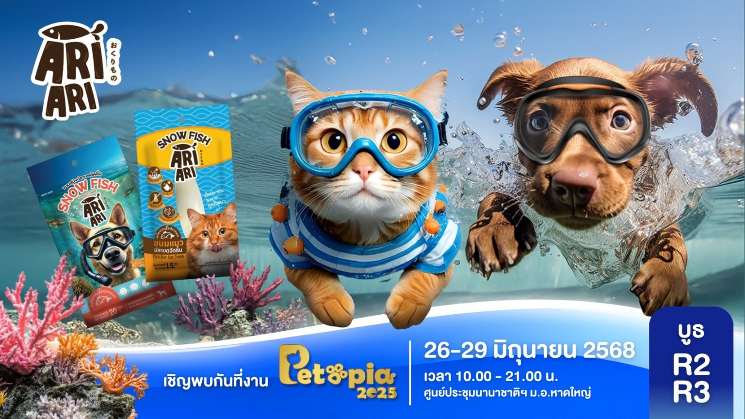 ผลิตภัณฑ์เด่นภายในงาน ได้แก่ “Ari Ari Snow Fish Treat” ขนมสัตว์เลี้ยงจากเนื้อปลาอิโตโยริบด ซึ่งเป็นวัตถุดิบทะเลคุณภาพสูง เนื้อนุ่ม หอม ย่อยง่าย อุดมด้วยโปรตีน ปราศจากวัตถุกันเสีย และผ่านกระบวนการผลิตในโรงงานที่ได้รับมาตรฐานเดียวกับอาหารคน เช่น HACCP และ ISO 22000 ภายในงาน Petopia Hatyai 2025 ยังเตรียมกิจกรรมส่งเสริมการตลาดและสิทธิพิเศษมากมายสำหรับผู้เข้าร่วมงาน อาทิ การแนะนำผลิตภัณฑ์ใหม่เป็นครั้งแรก การแจกของที่ระลึก รวมถึงกิจกรรมสร้างสรรค์ที่ออกแบบมาเพื่อสร้างประสบการณ์ร่วมระหว่างเจ้าของและสัตว์เลี้ยง