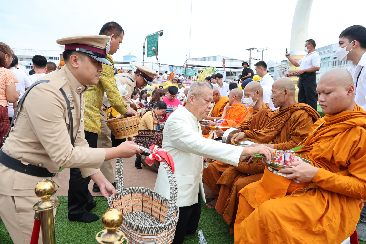 ผู้สื่อข่าวรายงาน ว่า เมื่อวันที่ 10 กรกฎาคม 2568 เวลา 07.09 น. ณ บริเวณอนุสาวรีย์พระยาสุรินทรภักดีศรีณรงค์จางวาง อำเภอเมืองสุรินทร์ จังหวัดสุรินทร์ พล.ต.ต.สุคนธ์ ศรีอรุณ ผู้บังคับการตำรวจภูธรจังหวัดสุรินทร์ พร้อมด้วย พ.ต.อ.เอกพงษ์ พลมณี ผกก.สภ.เมืองสุรินทร์, พ.ต.ท.สุรชัย ชัญถาวร รอง ผกก.สส.สภ.โนนนารายณ์ รรท.รอง ผกก.ป.สภ.เมืองสุรินทร์, ข้าราชการตำรวจ ฝอ.ภ.จว.สุรินทร์, ข้าราชการตำรวจ สภ.เมืองสุรินทร์, ส่วนราชการ ประชาชน และนักท่องเที่ยว ร่วมพิธีสงฆ์และพิธีทำบุญตักบาตรบนหลังช้าง โดยมี นายชำนาญ ชื่นตา ผู้ว่าราชการจังหวัดสุรินทร์ เป็นประธานในพิธี