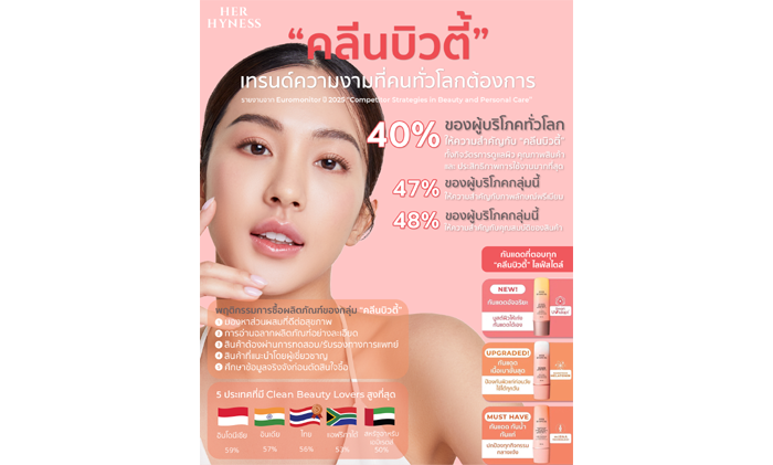 ● 40% ของผู้บริโภคทั่วโลกให้ความสำคัญกับ “คลีนบิวตี้” คือเป็นผู้ที่ให้ความสำคัญกับการดูแลผิวเป็นกิจวัตรให้ความสำคัญกับคุณภาพผลิตภัณฑ์ และประสิทธิภาพการใช้มากที่สุด