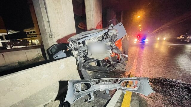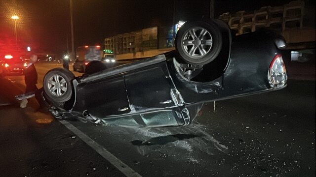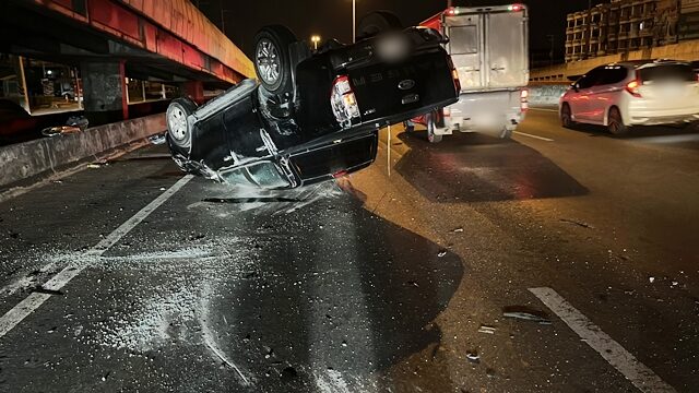 สภาพหน้ารถมีร่องรอยเฉี่ยวชนแบริเออร์ตัวรถพลิกคว่ำหงายท้องล้อชี้ฟ้า คนขับชื่อ นายธี (นามสมมติ) อายุ 33 ปี บาดเจ็บศีรษะแตก เจ้าหน้าที่นำส่งโรงพยาบาลธรรมศาสตร์เฉลิมพระเกียรติ