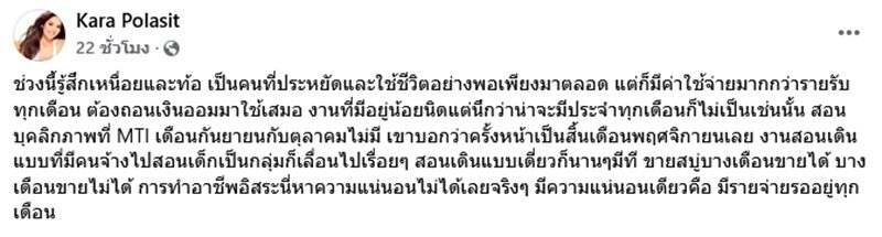 อ่านข่าวต้นฉบับได้ที่ : เหนื่อยท้อ! อดีตนางเอก คาร่า พลสิทธิ์ ตัดพ้อใช้ชีวิตพอเพียงมาตลอด กับสิ่งที่เจอตอนนี้
