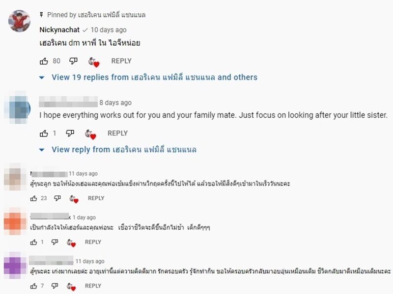 ขณะที่ นิกกี้ ณฉัตร ได้เข้ามาคอมเมนต์ใต้คลิปให้ติดต่อมาหาด้วยว่า เฮอ DM หาพี่ในไอจีหน่อย รวมทั้งแฟนคลับและคนในโลกโซเชียลแห่ให้กำลังใจอายุเท่านี้ต้องแบกรับภาระหนัก อาทิ เป็นกำลังใจให้นะครับ เฮอผ่านพ้นอุปสรรคชีวิตครั้งนี้ได้ โตขึ้นเฮอจะเป็นผู้ใหญ่ที่แข็งแกร่งครับ , สู้ๆนะลูกพี่เฮอร์ นู๋เข้มแข็งมาก ท้อได้เหนื่อยได้ ร้องไห้ได้ แต่เราก้อต้องเดินต่อ มองไปข้างหน้าเพื่อหนทางอยู่รอด พี่เชื่อว่าจะวิกฤตินี้ ลูกพี่เฮอร์จะแข็งแกร่งขึ้นพัฒนาเป็นเสาหลักของครอบครัวเป็นพี่ที่ดีของน้องได้ เป็นกำลังใจให้นะ เป็นต้น