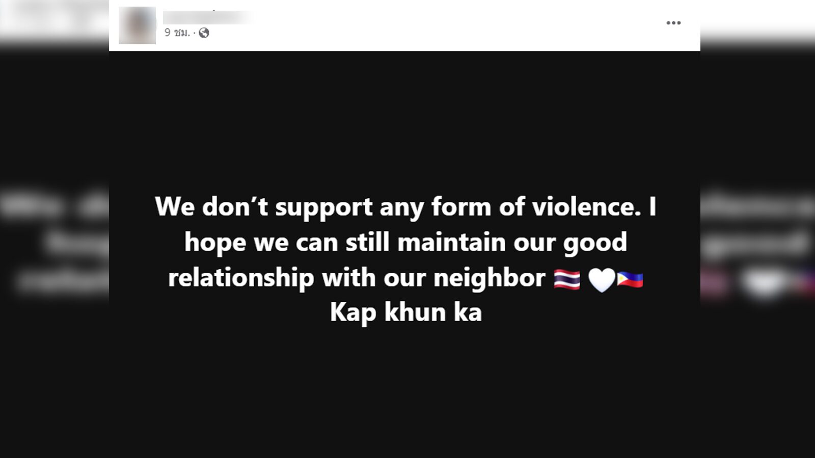 นอกจากนี้ ยังมีผู้ใช้เฟซบุ๊กอีกรายแท็กสถานทูตฟิลิปปินส์ในไทย ด้วยความหวังว่าเหล่าสาวสองฟิลิปปินส์จะสามารถกลับประเทศได้อย่างปลอดภัยในสภาพที่ดี ซึ่งตนไม่สนับสนุนความรุนแรงทุกรูปแบบ หวังว่าจะยังสามารถรักษาความสัมพันธ์ที่ดีระหว่างไทยกับฟิลิปปินส์ได้